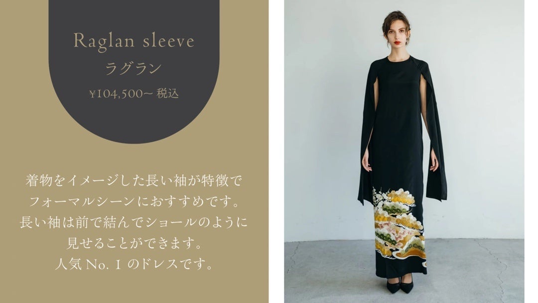 長い袖が特徴かつ着物らしさを演出するロングドレス。シンプルなラインをエレガントに見せるスリット入りの袖が特徴です。