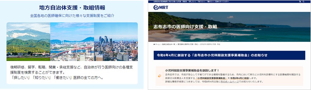 MRTは、今後多くの自治体に本サービスの情報発信を行い、自治体の提供する支援・取組に関する情報の充実化を図るとともにさらなるサービス向上に努め、自治体の支援・取組と医師との情報マッチングを促進してまいります。全国的な医師不足や地域偏在、診療科偏在、看護師をはじめとする医療従事者不足といったさまざまな医療課題の解決に向けより一層尽力してまいります。