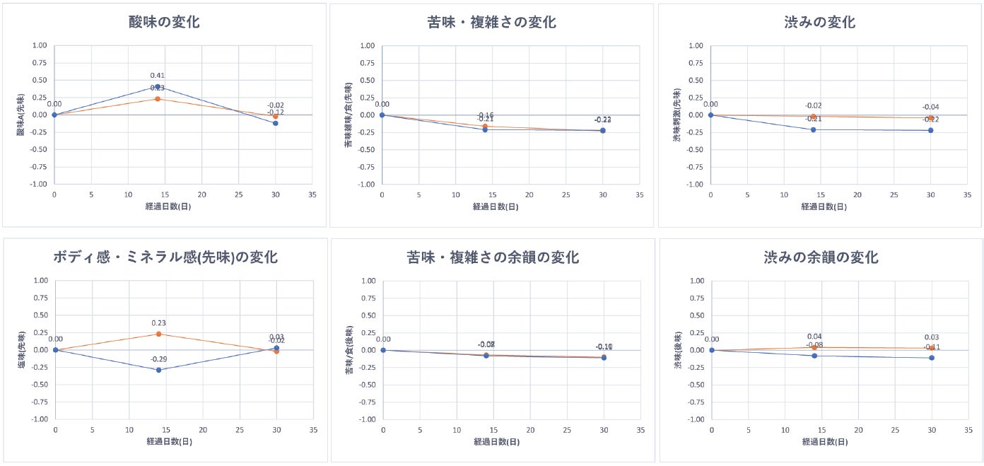 食品の「味」を数値化する手法を用いて味をわかりやすく表現し、12万件を超える味覚データベースを基軸に食にまつわるコンサルティングサービスを展開する株式会社味香り研究所の調べにより、開栓後のワインを当社の真空容器に詰め替えた状態でデータを取得したところ、常温保存・冷蔵保存ともに1ヶ月時点では味の変化はないというデータが取得できました。