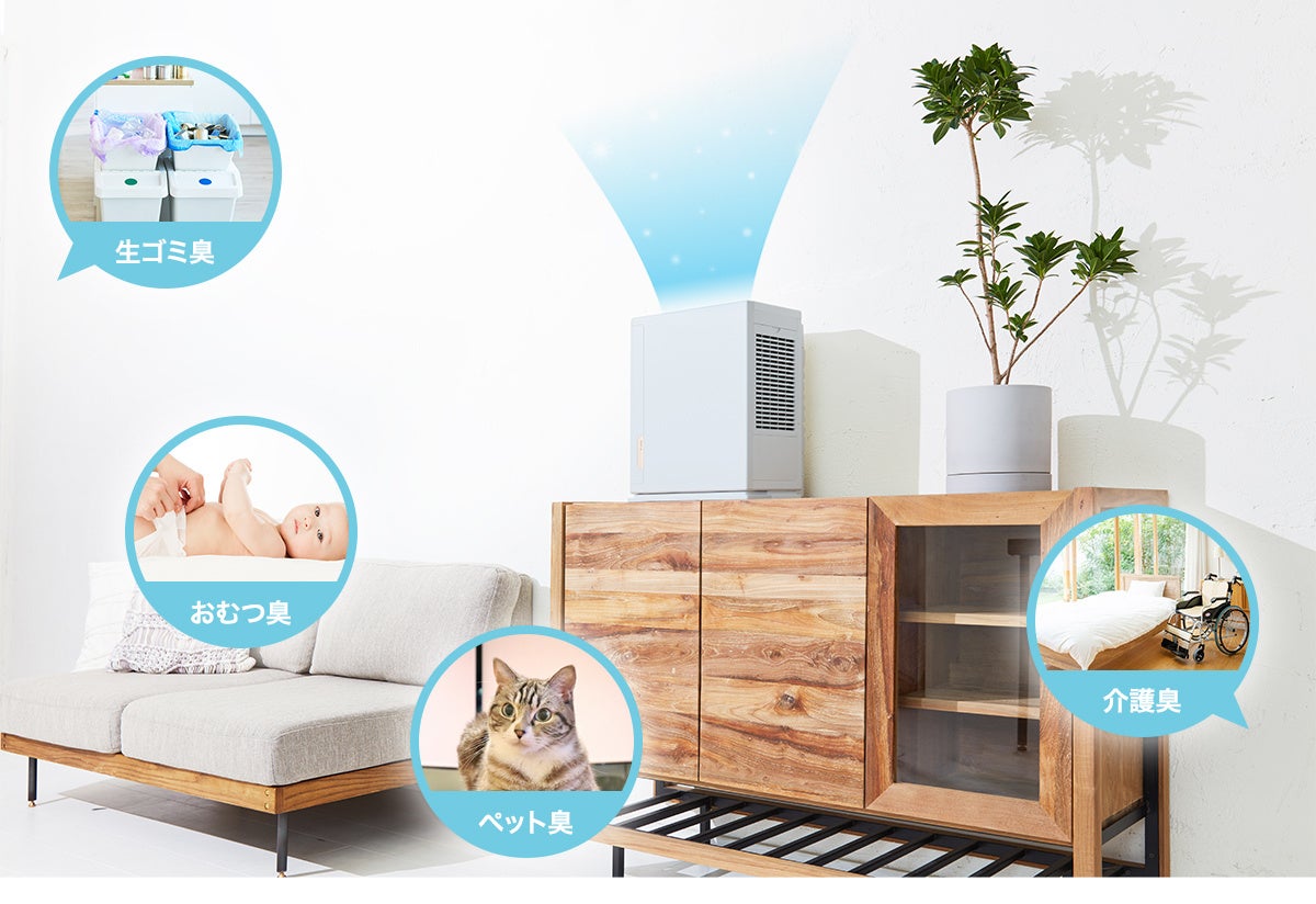 ペット臭・おむつ臭・生活臭を強力に脱臭。微量の次亜塩素酸を含む清潔な空気を放出。