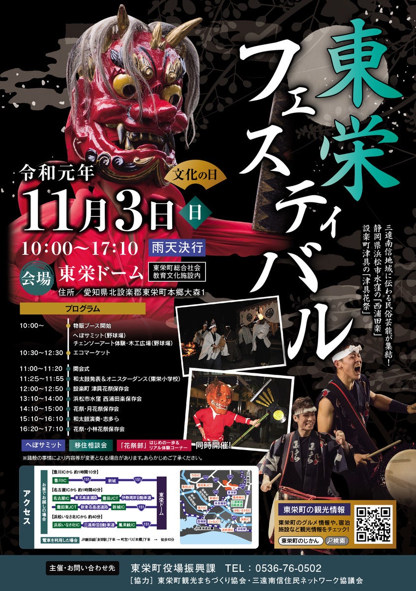 愛知県北設楽郡東栄町は静岡県との県境付近、奥三河と呼ばれる東三河地方山間部に位置する人口2900人の小さな町です。鎌倉時代末期から始まったとされる「花祭」は国の重要無形民俗文化財として指定されており、親から子、子から孫へと大切に伝承されてきた東栄町の大切な神事です。