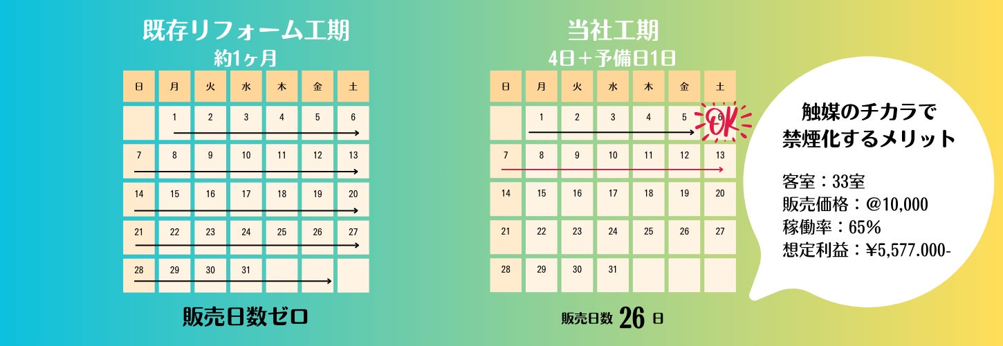『触媒のチカラ』とはリフォームを必要とせず、洗浄と触媒施工のみで、喫煙フロアを禁煙フロアに変えることができるサービスのことです。