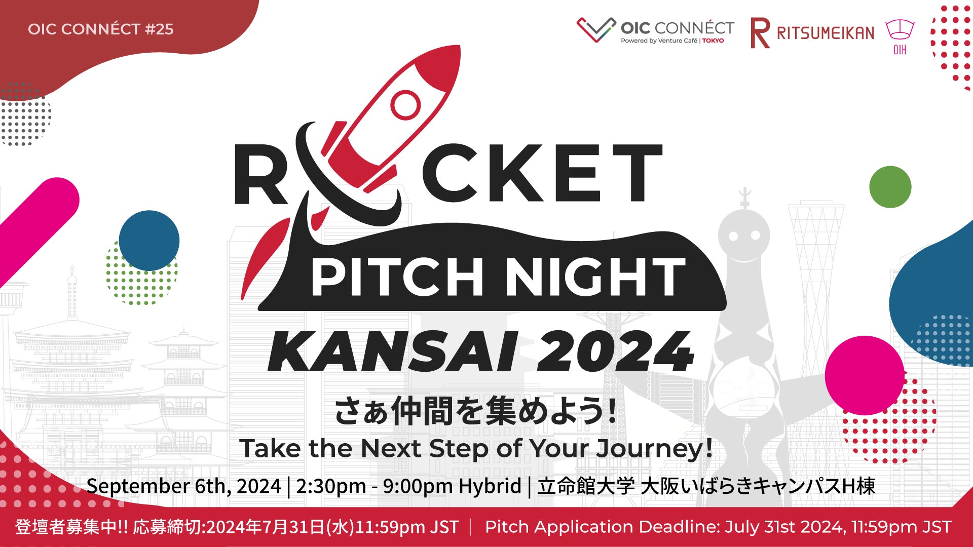 2024年5月に50組の起業家と参加者数1,100名以上が参加し、これまで総勢約630組以上の起業家と7,800名以上のオーディエンスが参加したROCKET PITCH NIGHTが、立命館とVenture Café Tokyoのコラボレーションで立命館大学大阪いばらきキャンパス(OIC)にて毎月1回開催している「OIC CONNÉCT」の特別回として、今年9月に関西で再び開催します。