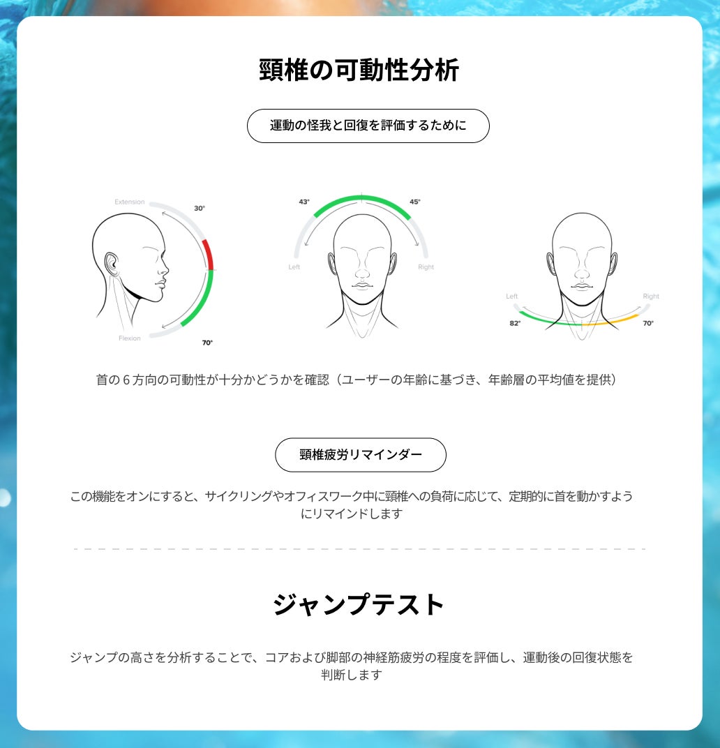内蔵センサーを利用して、頚椎の稼働範囲や垂直跳びの計測が可能です。計測データは、アプリにより自動的に分析され、ユーザーの身体状態を評価します。客観的にパフォーマンスの状況を把握できるので、過度なトレーニングによる故障や怪我を避けるためのガイダンスとして役立ちます。
