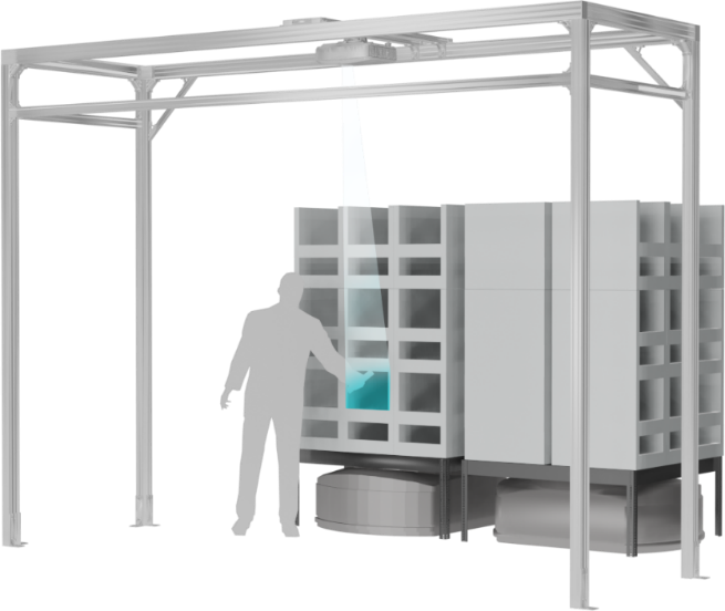 AGVが作業ステーションに到着すると、PPSにて取るべき間口が直接照らされ明示されます。PPSはセンサ機能を搭載しており、作業ミスをすると音と光で警告されます。AGVとPPSを組み合わせることで、省人化・作業負担軽減が進み、ステーション内のピッキング作業ナビゲーションによって作業効率UP・作業ミスの削減が可能となりました。