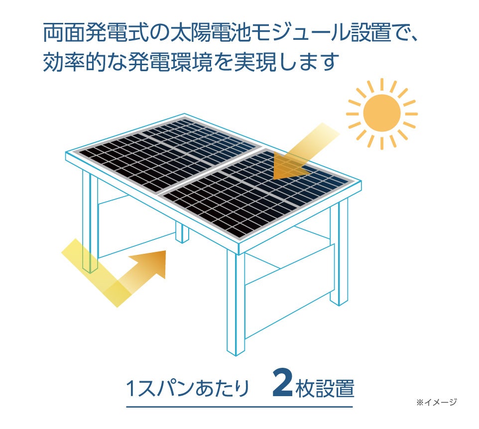 表面からだけでなく、裏面からも発電が可能な両面発電設計。地面からの反射光や、空気中の散乱日射も効率的に取り入れるため、ムダなく発電できます。(※5スパン以上の設置を推奨しています。)