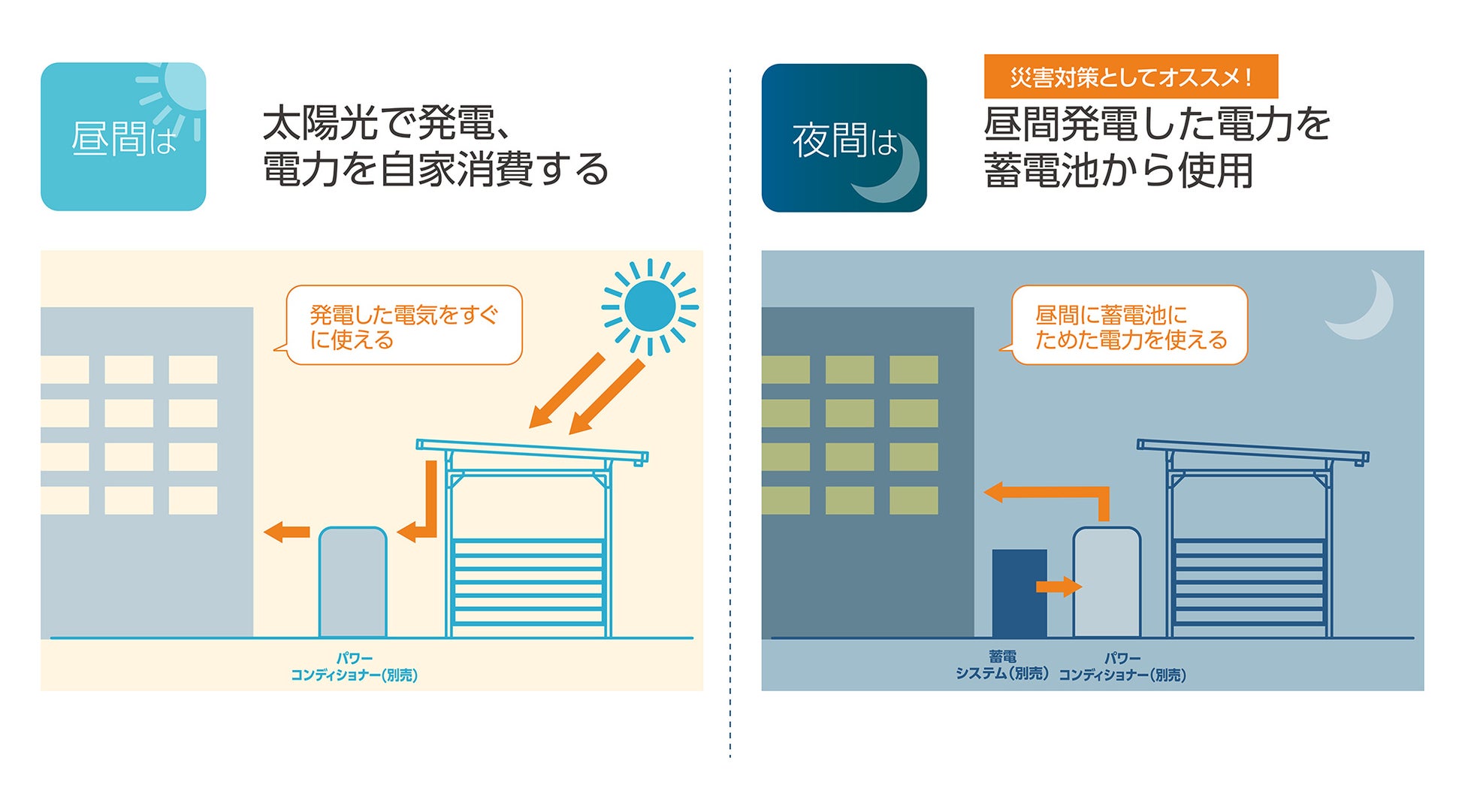 近年のエネルギー価格高騰により、国内で電気代削減のニーズが高まっています。太陽光発電システムを導入することで、敷地内の駐輪場スペースで発電が可能に。電力の売電や、自家消費による経済的メリットがあります。さらに蓄電池を設置することで、昼間にためた電力を夜間・停電時に使うことが可能なため、災害対策製品としても利用可能です。