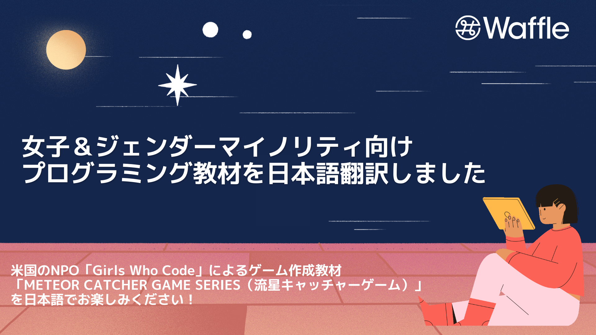 IT分野のジェンダーギャップの解消を目指す特定非営利活動法人Waffle(東京都港区、以下Waffle)は、米国のNPO団体「Girls Who Code(ガールズ・フー・コード、以下GWC)」が提供する家庭学習用プログラミング教材「CODE AT HOME METEOR CATCHER GAME SERIES」を、日本の女子およびジェンダーマイノリティ(*1)の中高生や大学生に向け日本語翻訳しました。