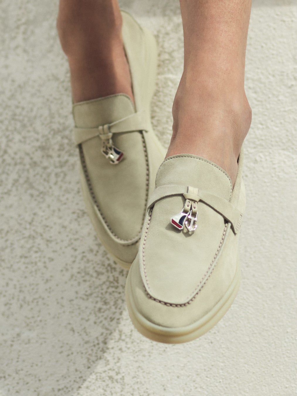 ホワイトソール・シューズを代表する〈サマー・ウォーク〉は、クラシックなデッキシューズに代わる自然でエレガントなシューズとして2006 年にポルトフィーノで誕生しました。アッパーは、高品質で撥水・防汚加工を施したスエード素材。ソフトでありながらフォルムが崩れない絶妙な厚みに仕上げられています。ソールはロロ・ピアーナのアイコニックなホワイトソール。天然ゴムとテクニカル素材のブレンドです。アッパーの下部には、靴づくりの伝統に則った蝋引き糸を用いて職人の手仕事によりステッチが施されています。メゾンのイニシャルが刻印されたチャームがアクセントの〈サマー・チャーム・ウォーク〉は、ロロ・ピアーナのレディス・シューズを象徴するアイコンです。