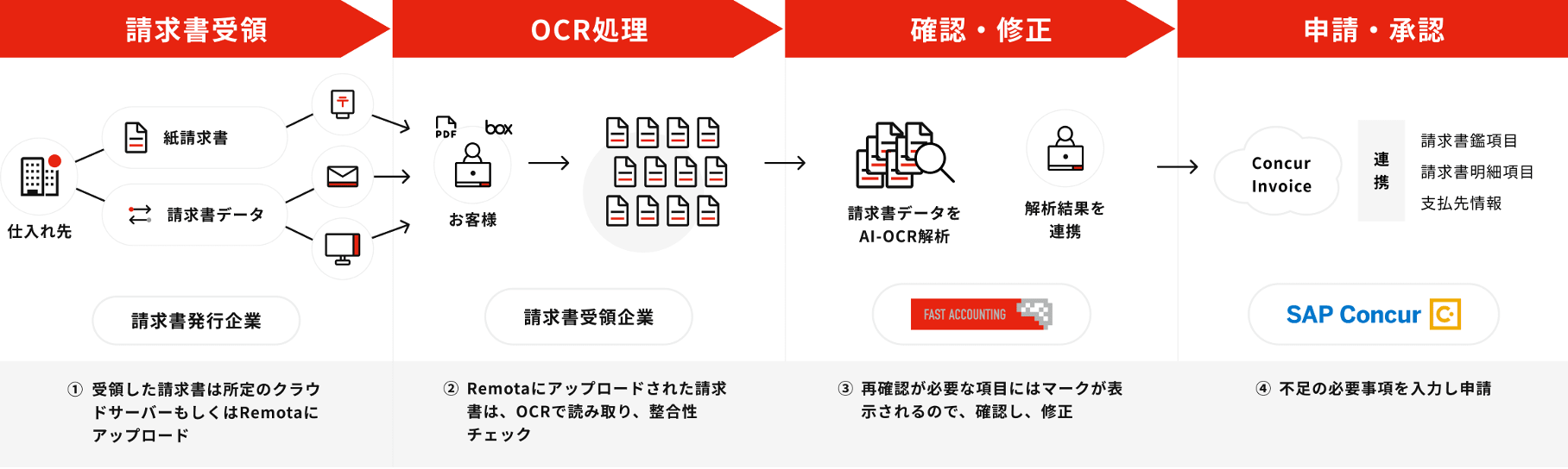 Remota と請求書管理クラウドサービス「Concur Invoice」は、シームレスにデータ連携をすることができ、請求書支払処理のプロセスの一つである入力工数の削減を目指します。