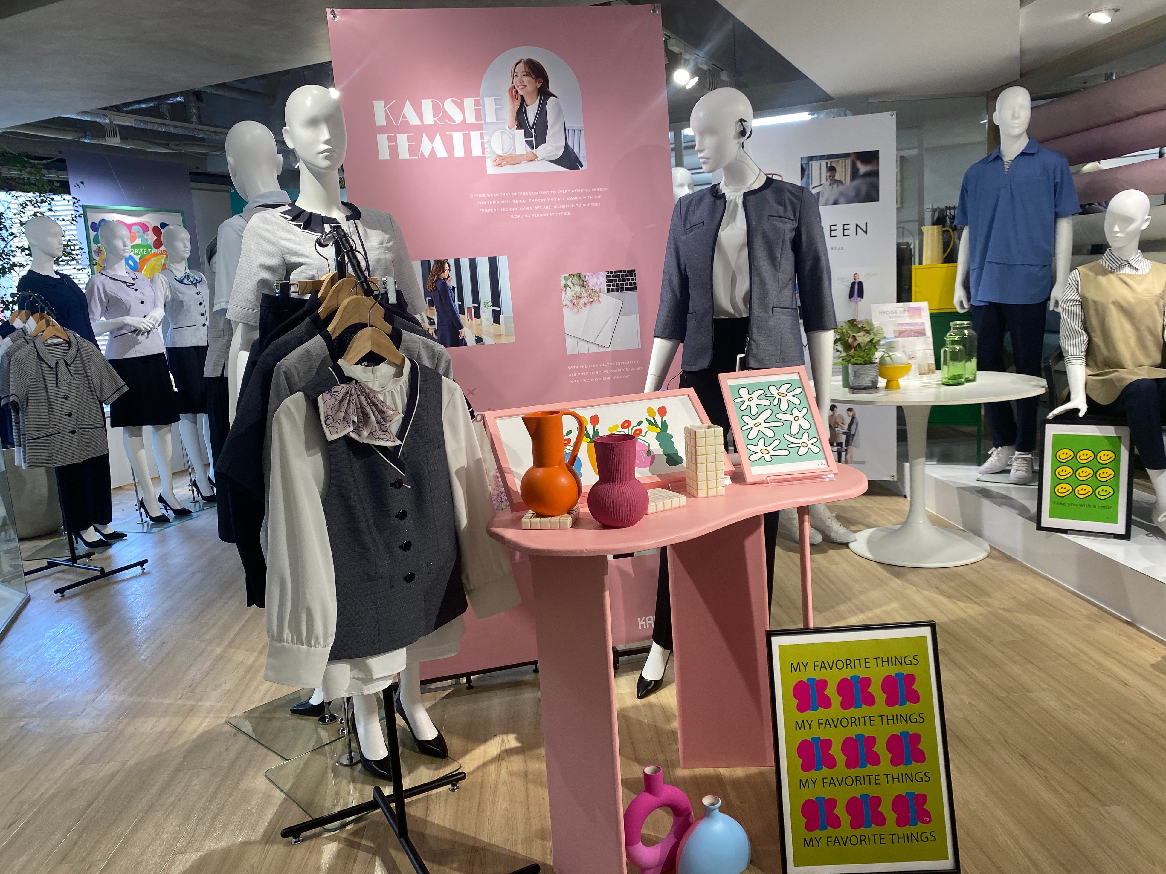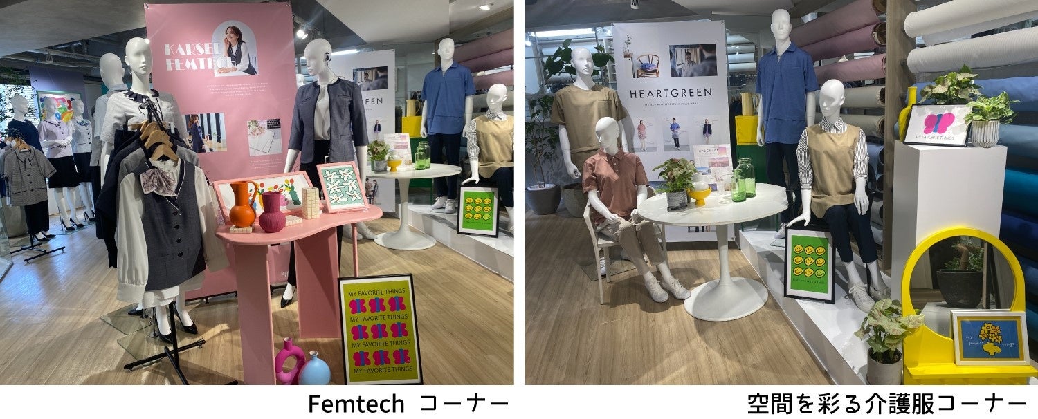 「ウェルビーイングな働き方」に目を向け、働く人がより”幸福”で”健康”に働けるようなユニフォームを展示。中でも、働く女性の悩みに寄り添った「Femtech」コーナーでは、汗に対する悩みを軽減するためのユニフォームや温活を促すユニフォーム、キレイな姿勢を促す工夫が施されたユニフォーム等を紹介。女性の悩みに寄り添った商品開発のために設置された、社内女性によるプロジェクトチームを中心に、働く女性が抱える想いをマーケティングして作られた商品を展示しています。