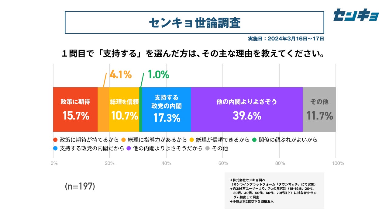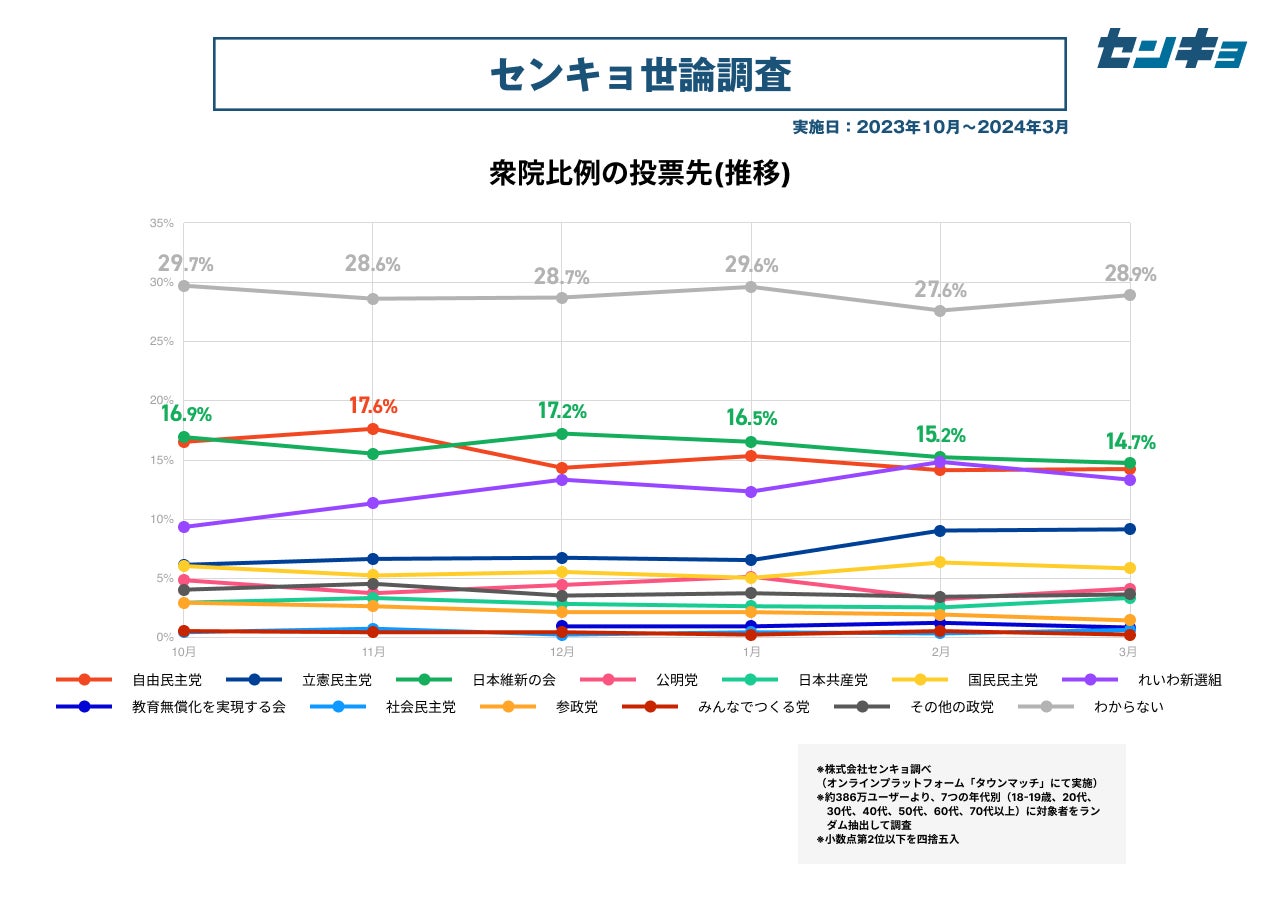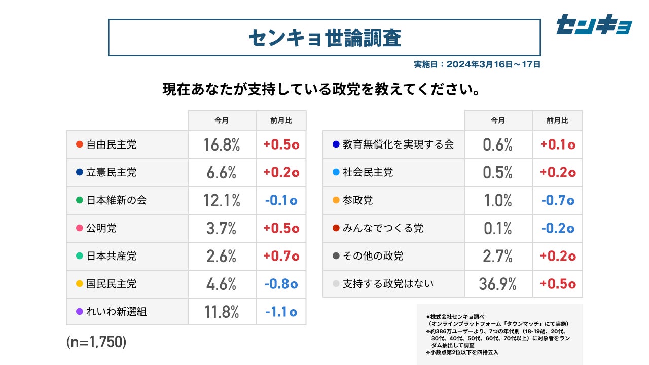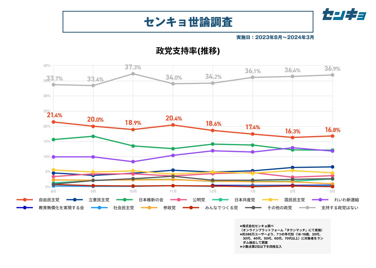 株式会社センキョ(所在地:東京都港区、代表取締役:堀 浩之)は、2023年8月より毎月、自社で運営する全国386万人余りの市民が参加するプラットフォーム「タウンマッチ」において、内閣の支持率や政党の支持率などを調査する「世論調査」を実施しています。政治に関する新たな調査データとして、政治関係者や有識者だけではなく、幅広く多くの方にご活用いただけますと幸いです。