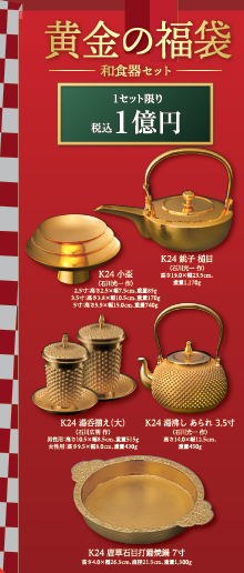 新年が輝かしい年になることを祈って、最上級の福袋をご用意しました。純金の茶器や鍋など和食器のセットで、限定1点、価格は税込み1億円にて、販売いたします。