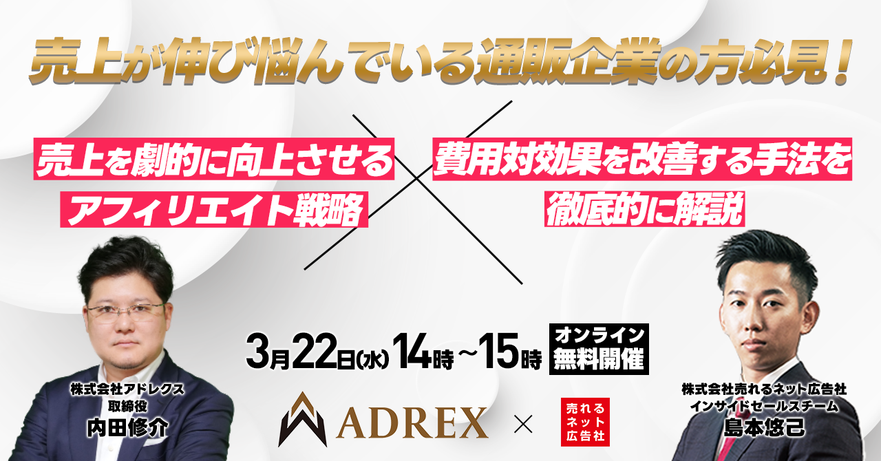Web広告業界を席巻するWebマーケティングのスペシャリスト集団 株式会社ADREX(本社:東京都港区、代表取締役:田代隼人、以下アドレクス)は、D2C(ネット通販)とネット広告に特化したクラウドサービスやコンサルティングサービスを提供する株式会社売れるネット広告社(本社:福岡県福岡市、代表取締役:加藤公一レオ、以下売れるネット広告社)と共に、「売上を劇的に向上させるアフィリエイト戦略×費用対効果を改善する手法を徹底的に解説」Webセミナーを開催することをお知らせいたします。