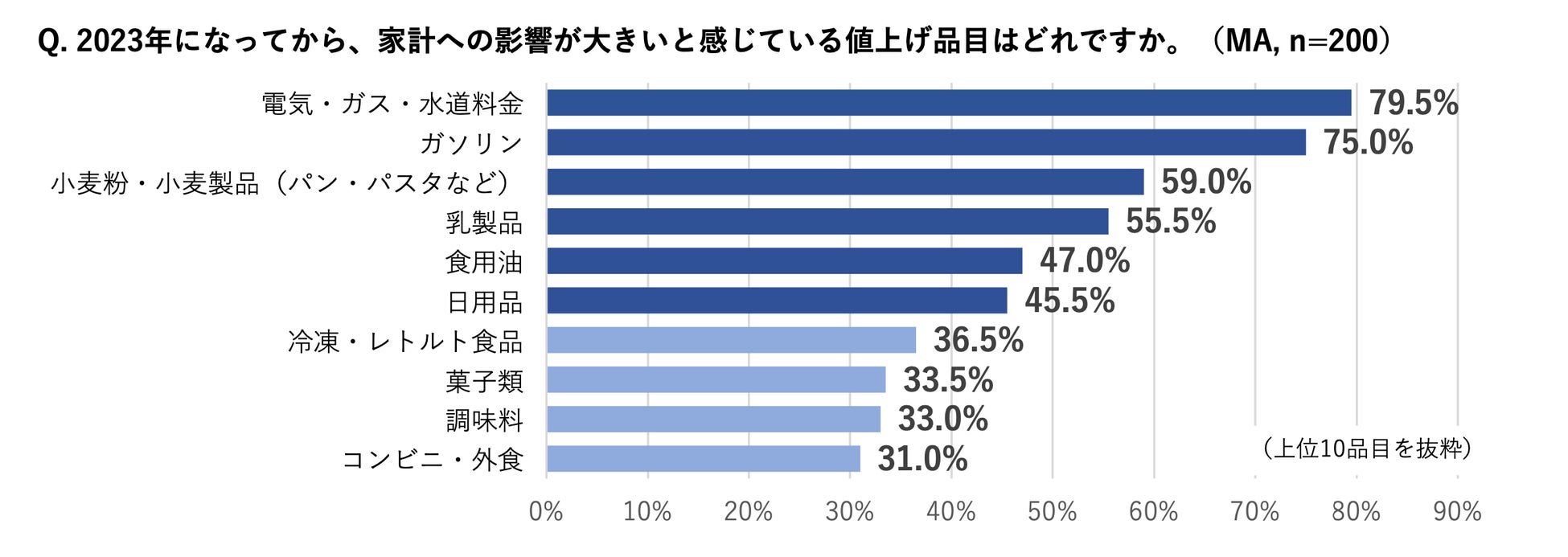 2023年になってから、家計への影響が大きいと感じている値上げ品目について聞いたところ、「電気・ガス・水道料金」と回答した人が約8割(79.5%)と最も多い結果となりました。2位は「ガソリン(75.0%)」、3位は「小麦粉・小麦製品(パン・パスタなど)(59.0%)」、4位は「乳製品(55.5%)」、5位は「食用品油(47.0%)」、その他上位には「日用品(45.5%)」や「冷凍・レトルト食品(36.5%)」があがっており、日常生活に密接な品目の値上げが家計の負担となっていることがあらためて明らかになりました。
