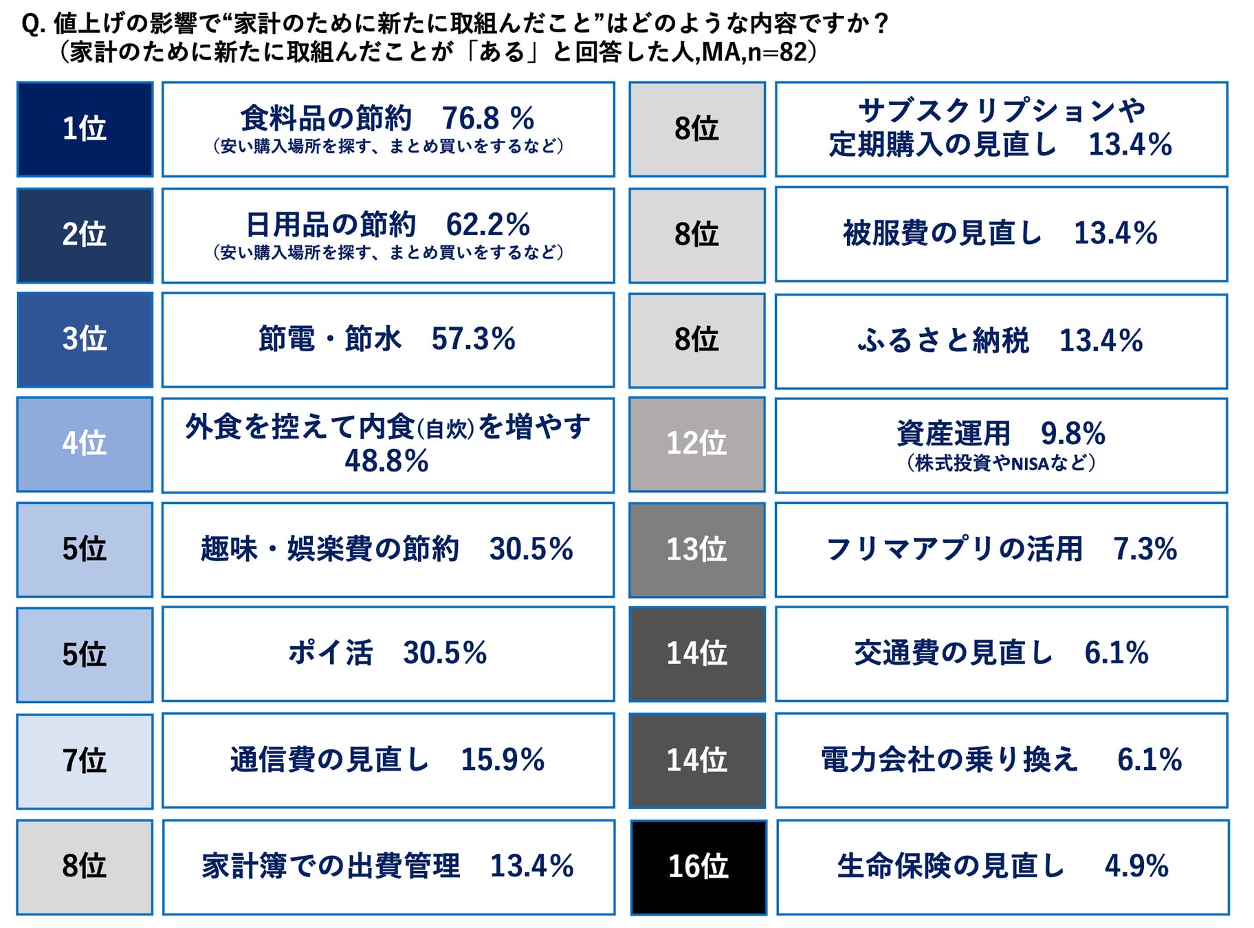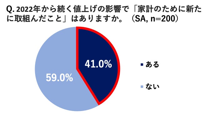 値上げの影響で“家計のために新たに取組んだこと”があるか聞いたところ、約4割(41.0%)が「ある 」と回答しました。 実際に取組んだことをランキング形式で見ると、 1位「食料品の節約(76.8%)」、2位「日用品の節約(62.2%)」、3位「節電・節水(57.3%)」、4位「外食を控えて内食(自炊)を増やす(48.8%)」、5位「趣味・娯楽費の節約」「ポイ活」(30.5%)という結果となり、支出を抑える“節約”の意識が高まっていることがうかがえます。