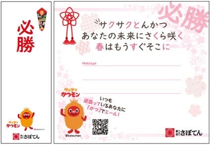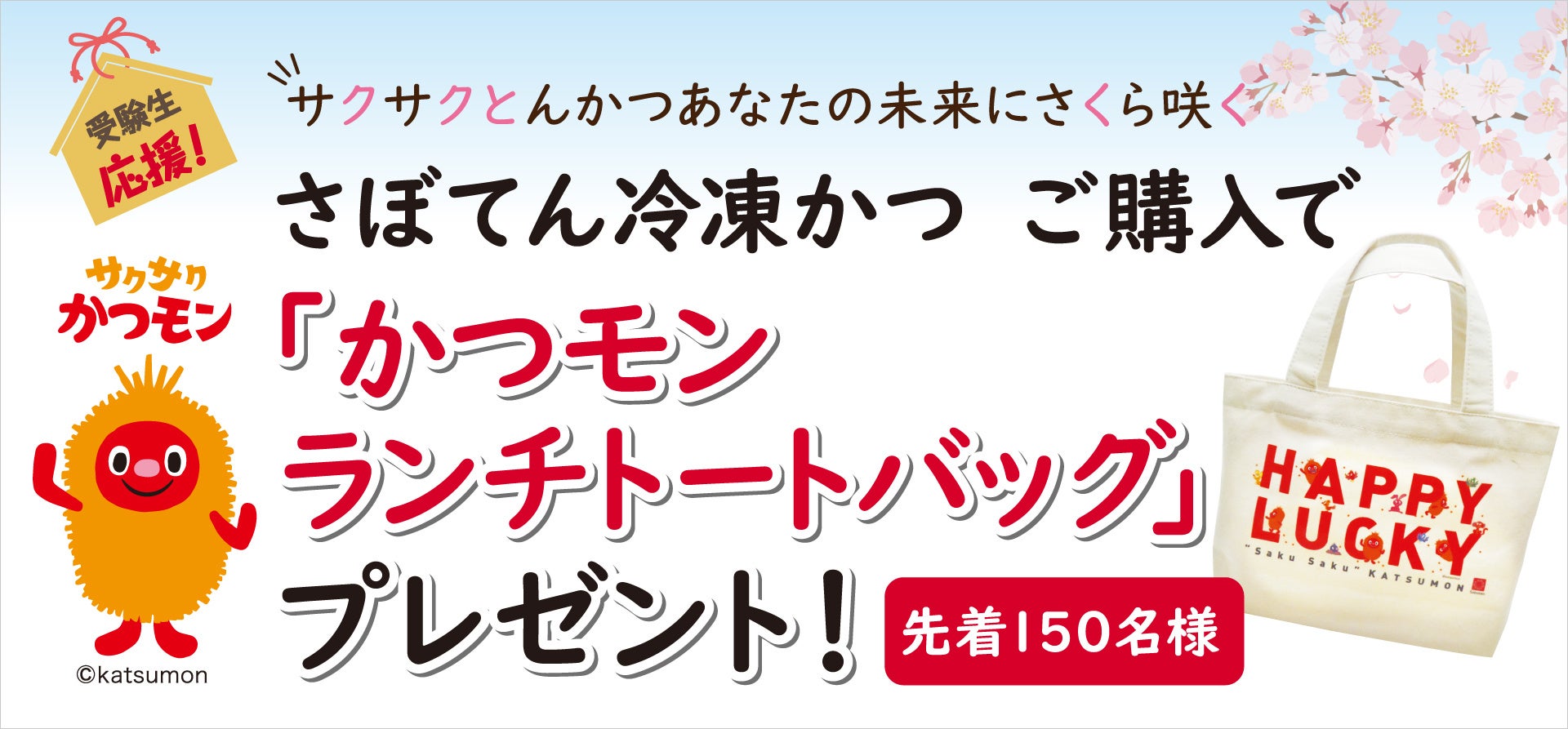 「受験に勝つ(かつ)」にかけ、さぼてんの冷凍かつ7商品から1点以上をご購入いただいた先着150名様に、幸せの結晶をふりまくさぼてん公式キャラクター、「サクサクかつモン」のランチトートバッグを1月12日(水)ご注文分よりプレゼント。さらに、サクサクのとんかつを召し上がる受験生の未来が“さくら咲く(サク)”ものであるよう、願いを込めたオリジナルメッセージカードを添え、必勝熨斗を付けて商品をお届けします。