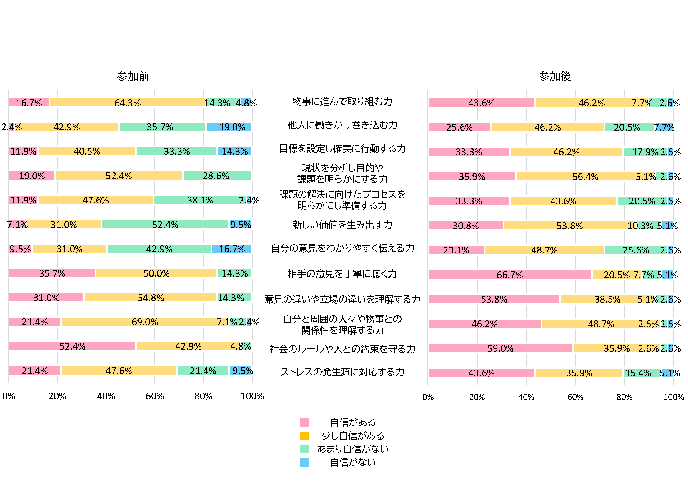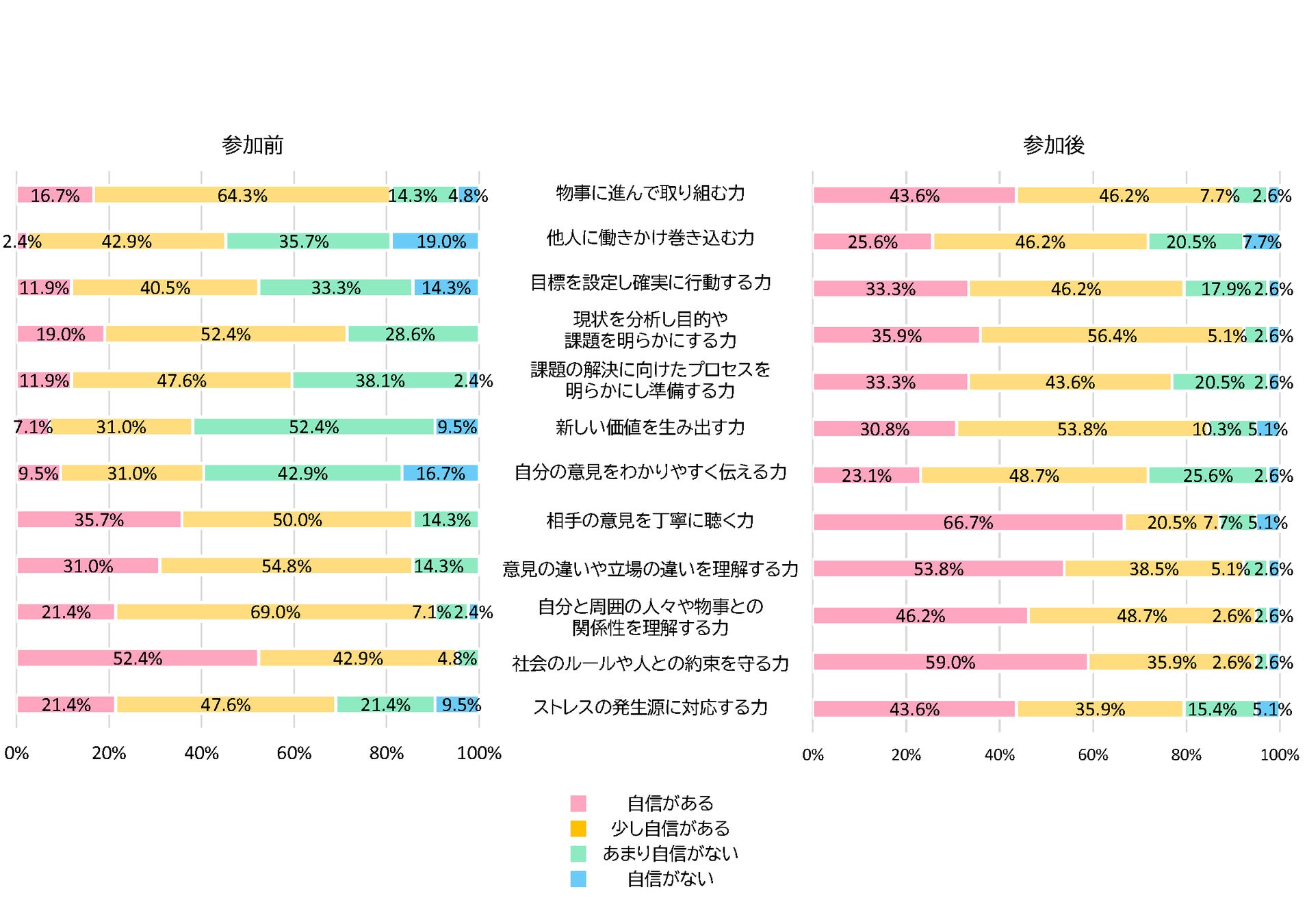 社会人基礎力として掲げられている項目をもとにアンケートを行った結果、ワークショップ参加前と参加後に「自信がある」と回答した数値に関して、ワークショップ参加前と参加後で、特に以下の項目において顕著な効果が見られました。