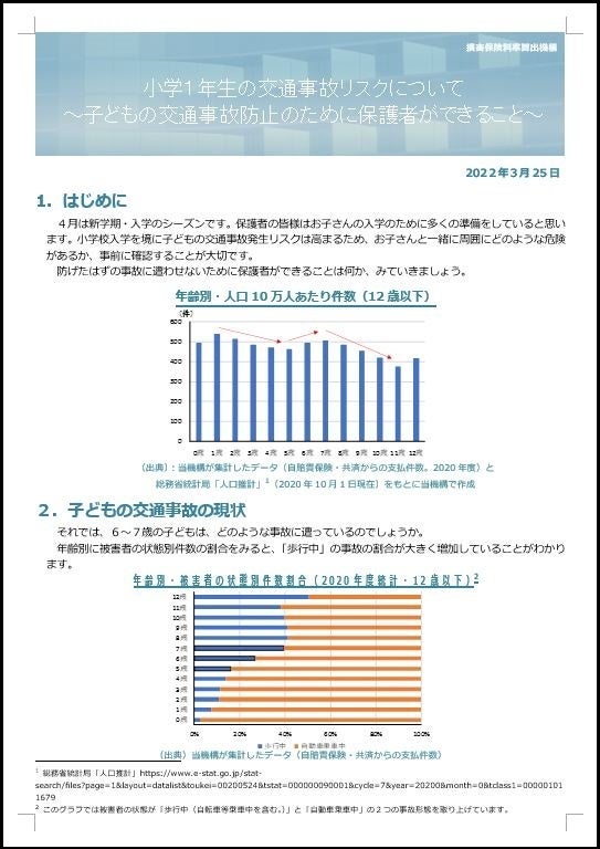 今回は、『小学1年生の交通事故リスクについて~子どもの交通事故防止のために保護者ができること~』を当機構ウェブサイトに公表しましたので、ご案内いたします。