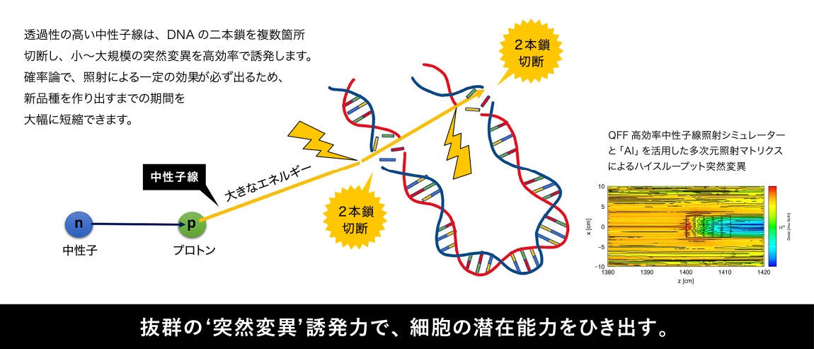 中性子線ビーム照射を用いたQFF社の突然変異誘発力は、参入障壁の高い独自アプローチです。短期間・大量照射による高パフォーマンス育種は、食品、化学・バイオメーカーや、種子メーカーの評価も高まっています。
