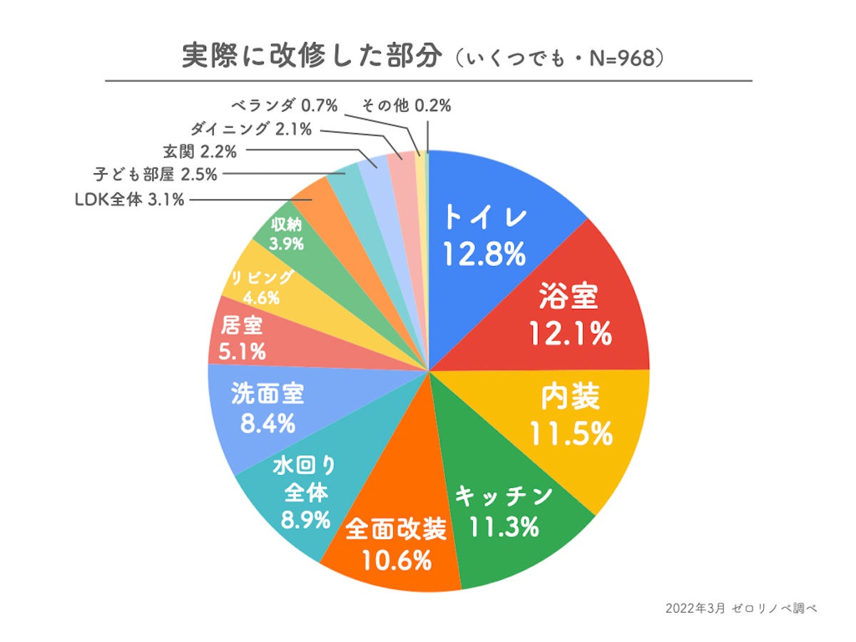約半数が水回りを占める。次いで収納、内装、居室という結果に。