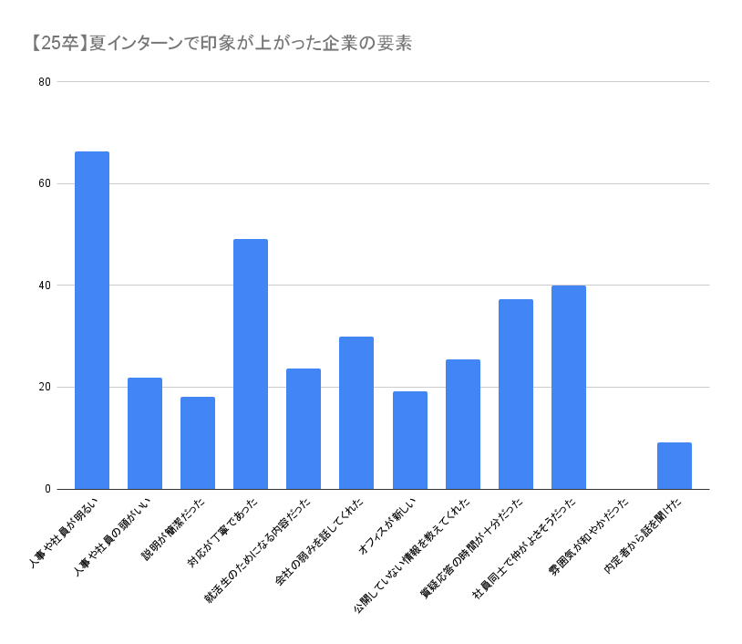 印象が良かった会社の特徴として、「人事や社員が明るい」「雰囲気が和やか」「対応が丁寧だった」などが上位を占める結果になりました。以上を踏まえると、25卒就活生は「社風」が魅力的であるかどうかを意識する一方で、プレゼンテーションの正確性に関する重要度は比較的低いことが分かります。