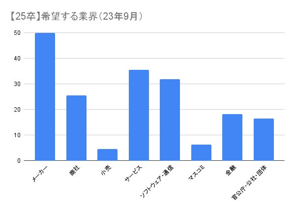 25卒に最も人気の業界はメーカーであり、次がサービスであることが分かりました。前回、25卒を対象に8月に行ったアンケートも同様の結果となりました。夏インターンを終えた前後で、人気業界は変わらなかったことが分かります。