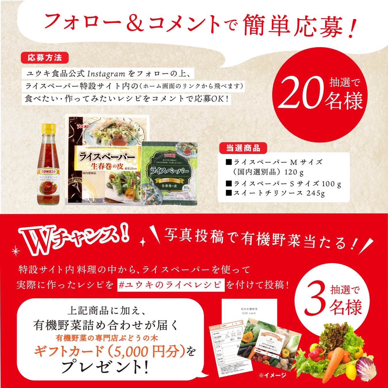 ユウキ食品公式アカウント(https://www.instagram.com/youki_shokuhin/)フォロー+該当投稿にライスペーパー特設サイトで見たレシピで食べたい・作ってみたいレシピをコメントで生春巻きセット(ライスペーパー2種+スイートチリソース)が20名様に当たるキャンペーンを実施します。