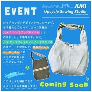 第1回目のイベントでは、協力店舗(JUKIアップサイクルソーイングスタジオ※)にて、アパレルメーカーのイトキン株式会社(本社所在地:東京都渋谷区 代表取締役社長:前田和久 以下、イトキン)の協賛により、古着をバッグに作り替えるアップサイクルソーイングのワークショップを開催します。