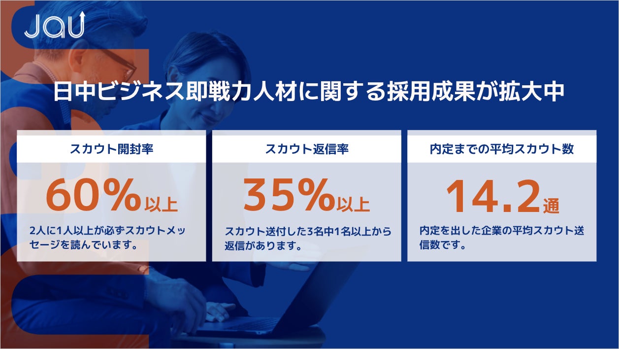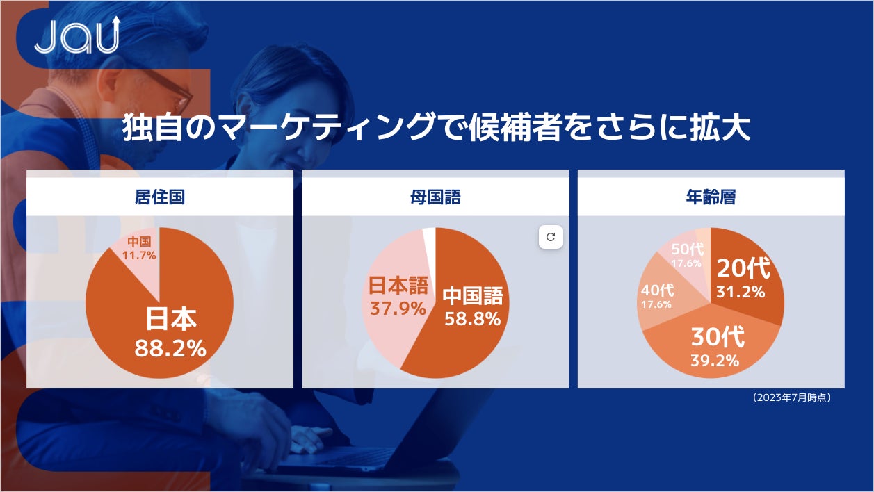 「JaU(ジャーヨウ)」は日中ビジネス即戦力人材に特化したダイレクトリクルーティングサービスです。2023年7月時点で6,800名以上の日中バイリンガル人材が登録しており、日本語・中国語・英語といった語学力に加えて、業務に必要とされるスキル・強みなどを可視化しています。中国語人材の母集団にすぐにアクセスしてチャット形式でやりとりできるため、人材と企業とのスピーディーなマッチングおよび採用を実現しています。