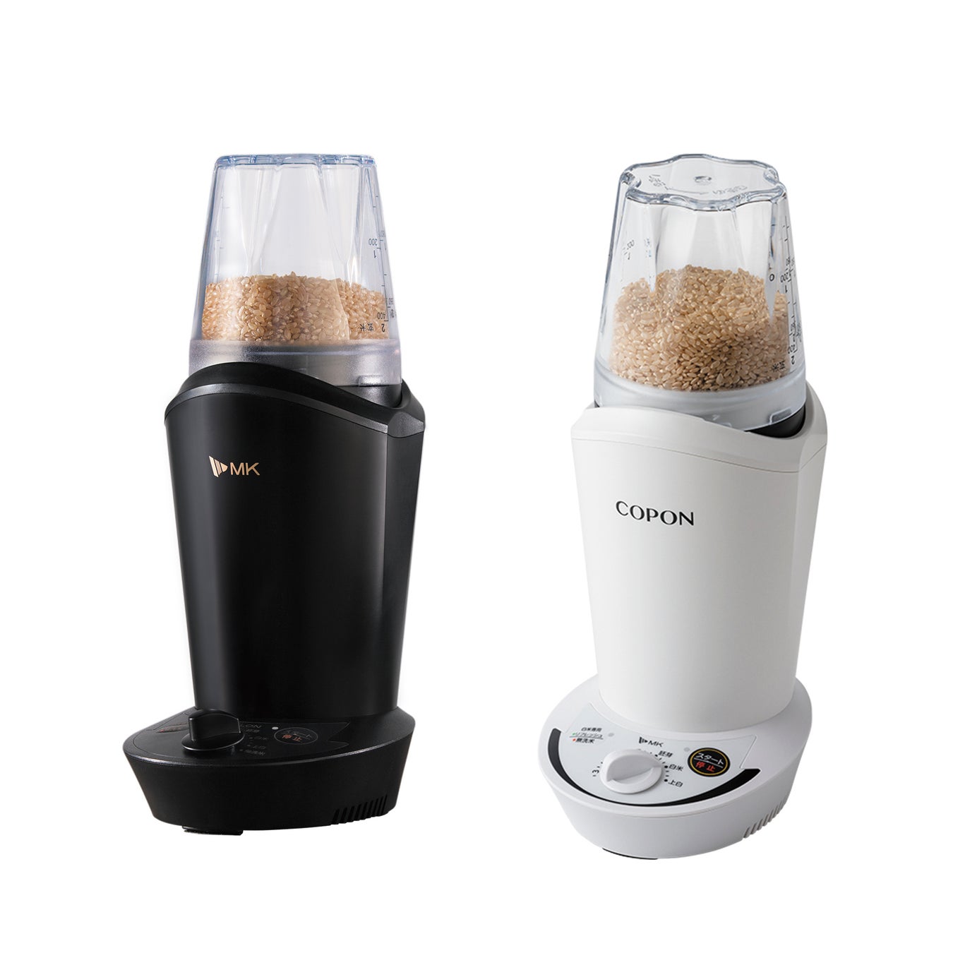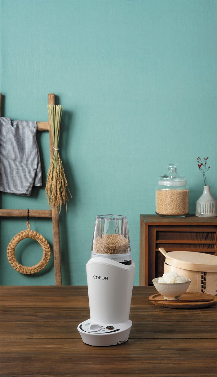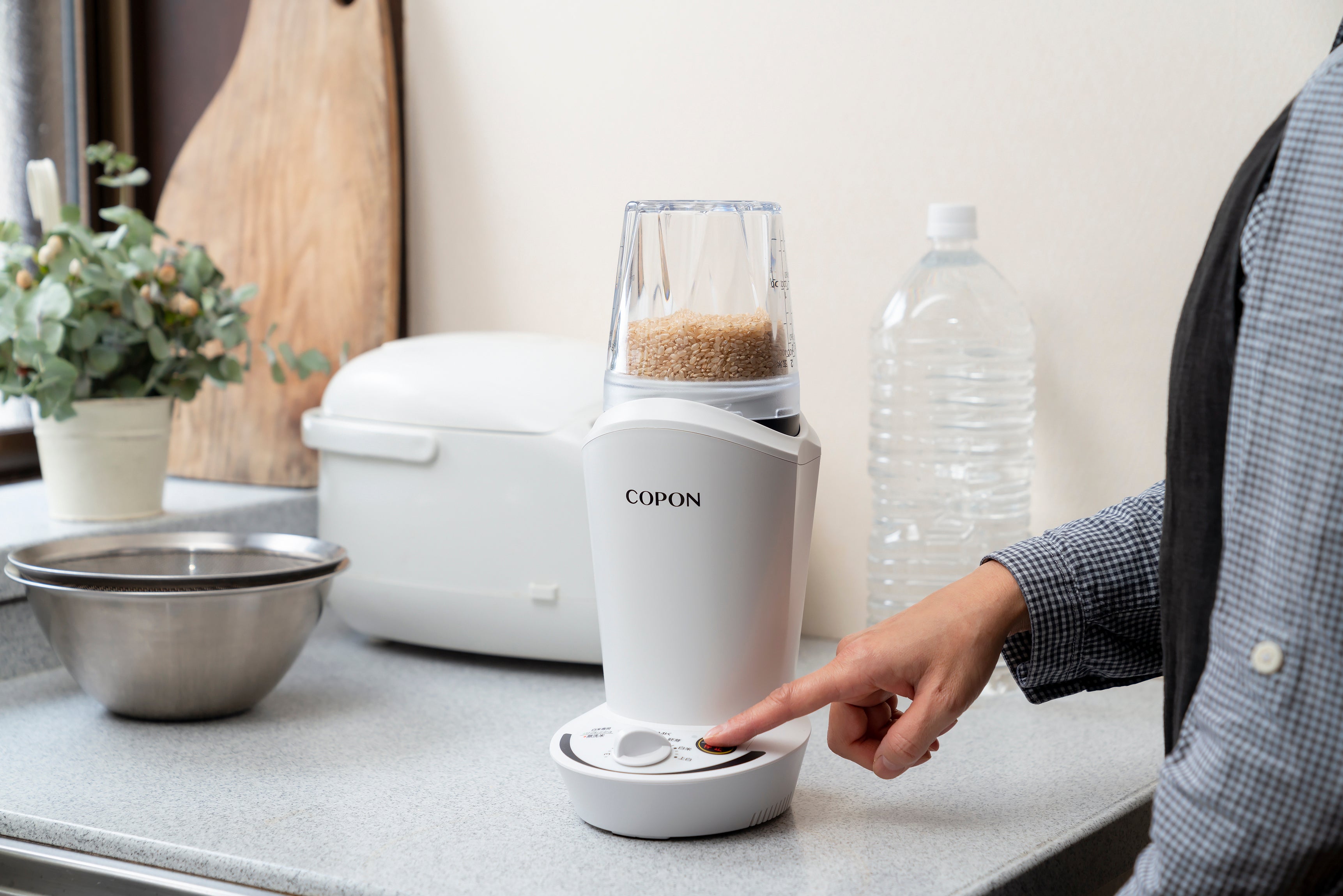 当社が展開する小型精米機「RICELON(ライスロン)」、「COPON(コポン)」は、操作性の高さと精米の仕上がりにこだわった製品です。2Lペットボトル程度のコンパクトなサイズで、置き場所を選ばず毎日気軽に使える点が、「おうち精米」のハードルを下げるポイントのひとつです。