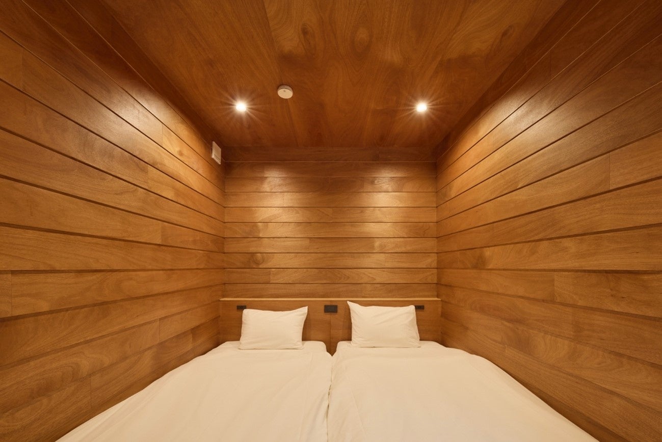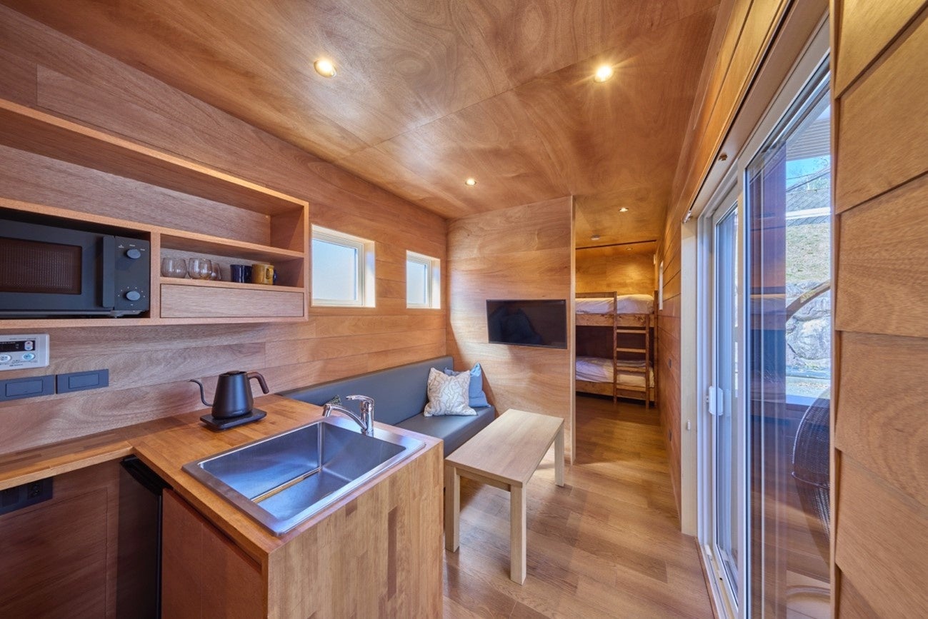 エリアノは、施設の滞在価値の向上を目的として、本施設のオリジナル宿泊キャビンを開発、工事を担当しました。宿泊キャビンは、一条工務店様の仮設住宅用コンテナを活用し、リデザインから施工まで実施いたしました。