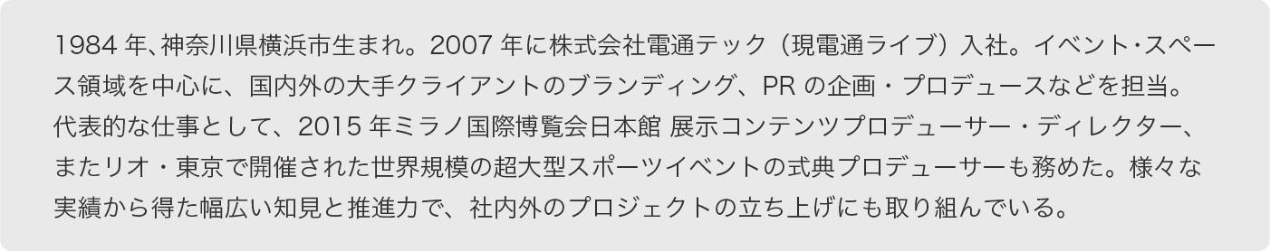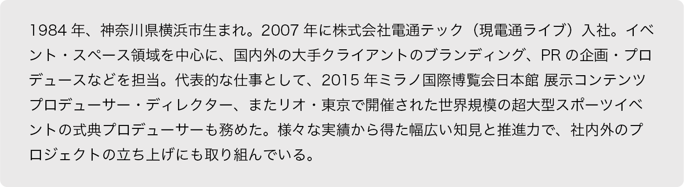 1984年、神奈川県横浜市生まれ。2007年に株式会社電通テック(現電通ライブ)入社。イベント・スペース領域を中心に、国内外の大手クライアントのブランディング、PRの企画・プロデュースなどを担当。代表的な仕事として、2015年ミラノ国際博覧会日本館 展示コンテンツプロデューサー・ディレクター、またリオ・東京で開催された世界規模の超大型スポーツイベントの式典プロデューサーも務めた。様々な実績から得た幅広い知見と推進力で、社内外のプロジェクトの立ち上げにも取り組んでいる。