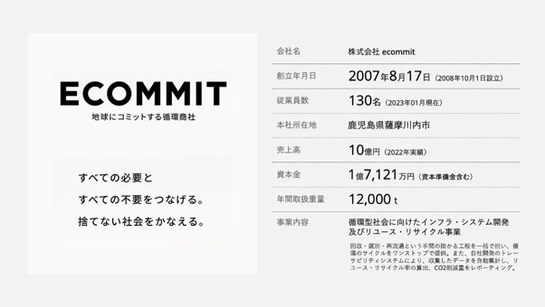 ECOMMITは「捨てない社会をかなえる」ために、ものが循環するインフラをビジネスで実現する循環商社です。