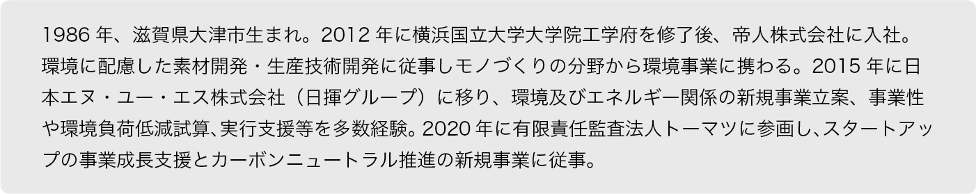 1986年、滋賀県大津市生まれ。2012年に横浜国立大学大学院工学府を修了後、帝人株式会社に入社。環境に配慮した素材開発・生産技術開発に従事しモノづくりの分野から環境事業に携わる。2015年に日本エヌ・ユー・エス株式会社(日揮グループ)に移り、環境及びエネルギー関係の新規事業立案、事業性や環境負荷低減試算、実行支援等を多数経験。2020年に有限責任監査法人トーマツに参画し、スタートアップの事業成長支援とカーボンニュートラル推進の新規事業に従事。