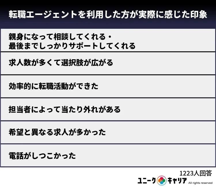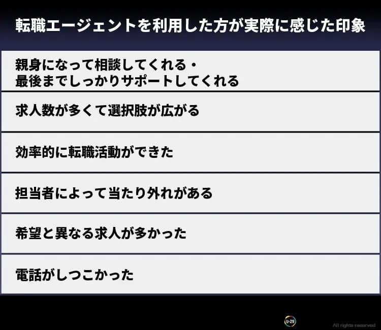 転職エージェントを利用した方が実際に感じた印象は表のようになっている。