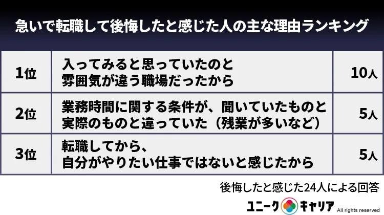 転職を急いだことで後悔したと感じた24人を対象にアンケートを実施した。