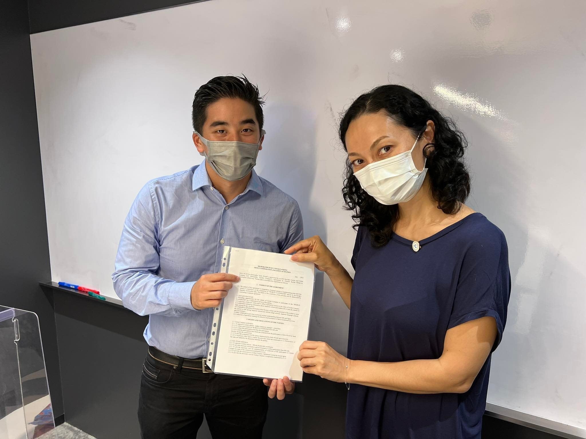 キルギスにおいては、現地の教育会社であるGlobal Compass社とMOU(包括連携協定)を締結しました(写真)。現地の学校へWorldClassroomの導入を促進し、日本の中高生との交流を行います。