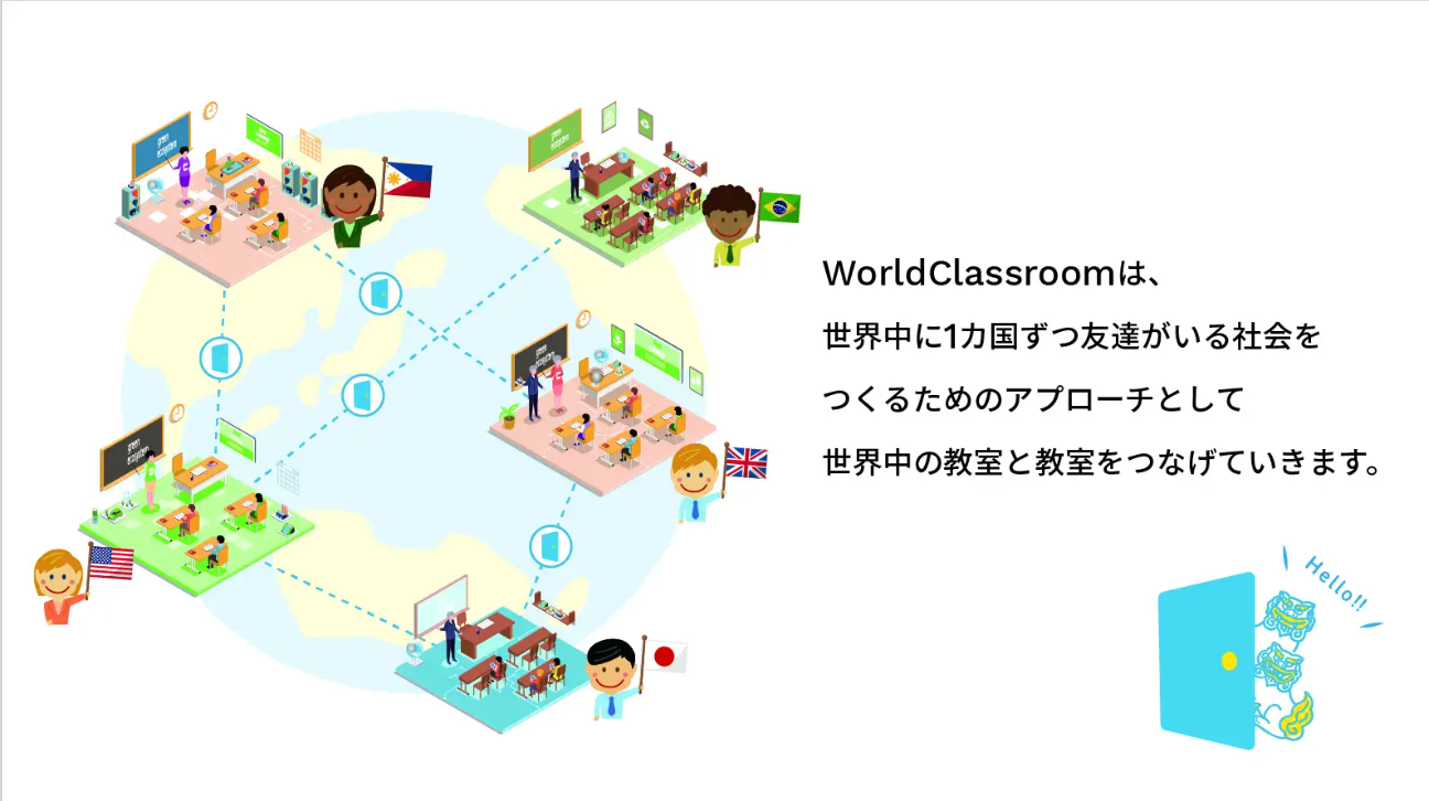 HelloWorldの『世界中に1か国ずつ友達がいることが当たり前の社会をつくる』とのミッションのもと統一して用いていた地球儀のアイコンから、扉のアイコンへ変更。公教育において「世界の教室をつなぐ扉」という意味を込めています。このWorldClassroomの扉を通じて、いつでも自由に海外と繋がる状態をつくる。そしてWorldClassroomを通じて生徒1人ひとりの新しい世界を広げるという意味を込めました。