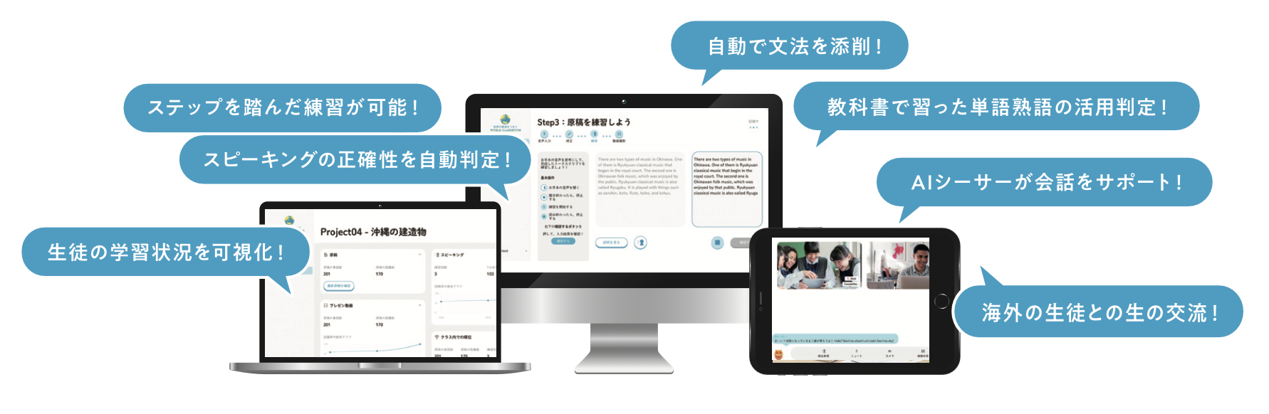 WorldClassroomとは、音声認識技術等を用いたスピーキング練習機能や世界中の同世代との国際交流機能が実装された英語教育DXクラウドシステムです。WorldClassroomを用いた授業を行うことで、生徒のスピーキング練習においてはそれぞれの英語力にあわせた学習を行うことを可能にすることができます。海外交流機能においては、海外の同世代と目的を持って英語を活用することを可能にします。