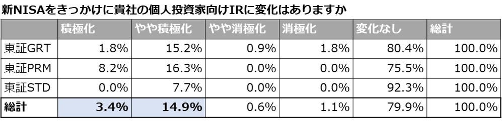 約2割の上場企業役員は、新NISAをきっかけに自社の個人投資家向けIRを「積極化」していくと回答しました。一部の企業では、すでに新NISA後の個人投資家に着目していることが伺えます。