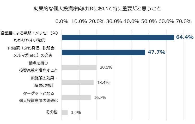 「経営層による戦略・メッセージのわかりやすい発信」(約6割)と「認知を高めるためのIR施策の実施」(約5割)を重要視