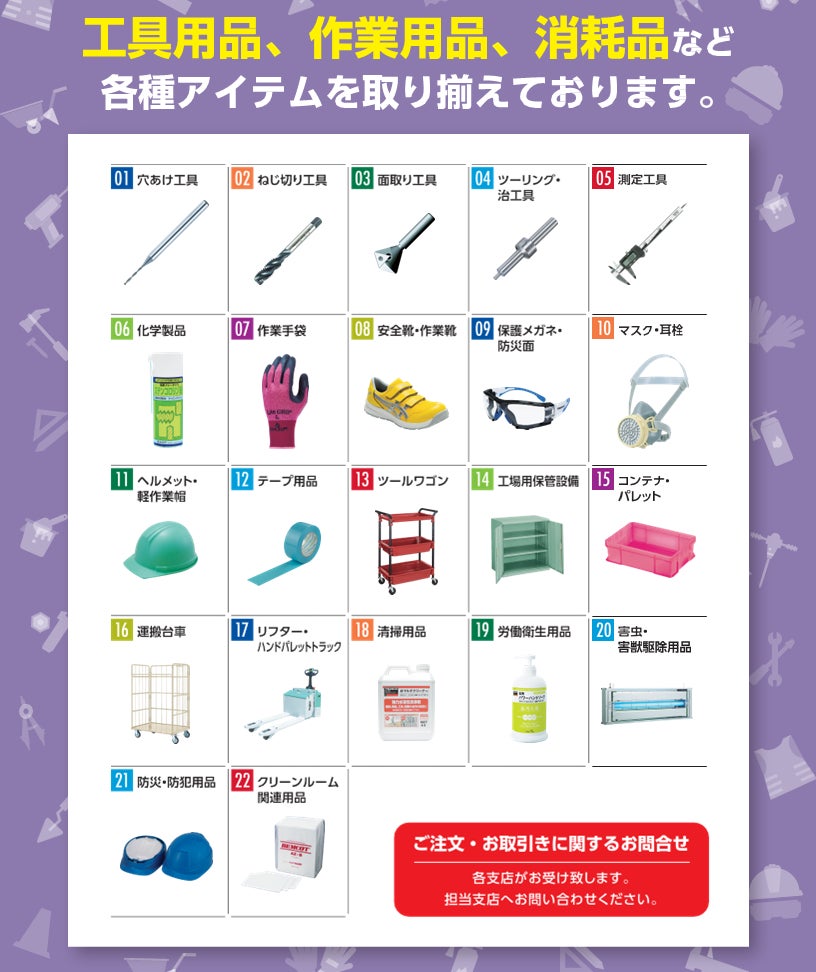 工具(穴あけ、ねじ切り、面取り)、ツーリング・治工具、測定工具、化学製品、作業手袋、安全靴・作業靴、保護メガネ・防炎面、マスク・耳栓、ヘルメット、テープ用品、ツールワゴン、工場用保管設備、コンテナ・パレット、運搬台車、リフター、ハンドパレットトラック 他