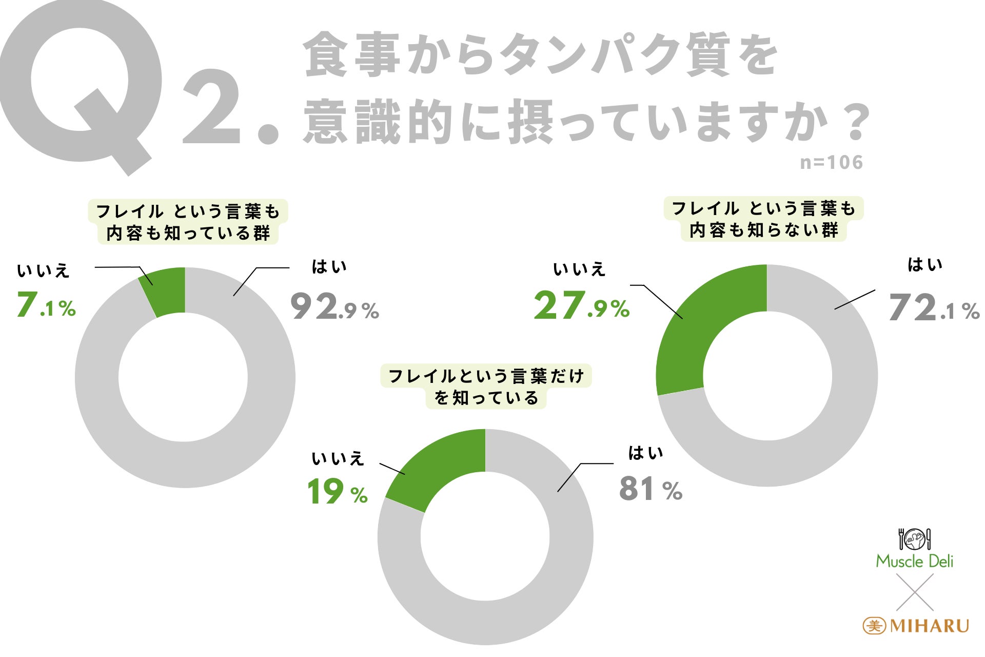 さらに、「食事からタンパク質を意識的に摂っていますか?」という問いに対しては、「フレイルという言葉も内容も知っている」と回答した92.9%が「はい」と答えた一方で、「フレイルという言葉も内容も知らない」と回答した人は「いいえ」が27.9%と、言葉の意味を正しく理解していない人ほど食事にタンパク質を摂りいれていないことが分かりました。