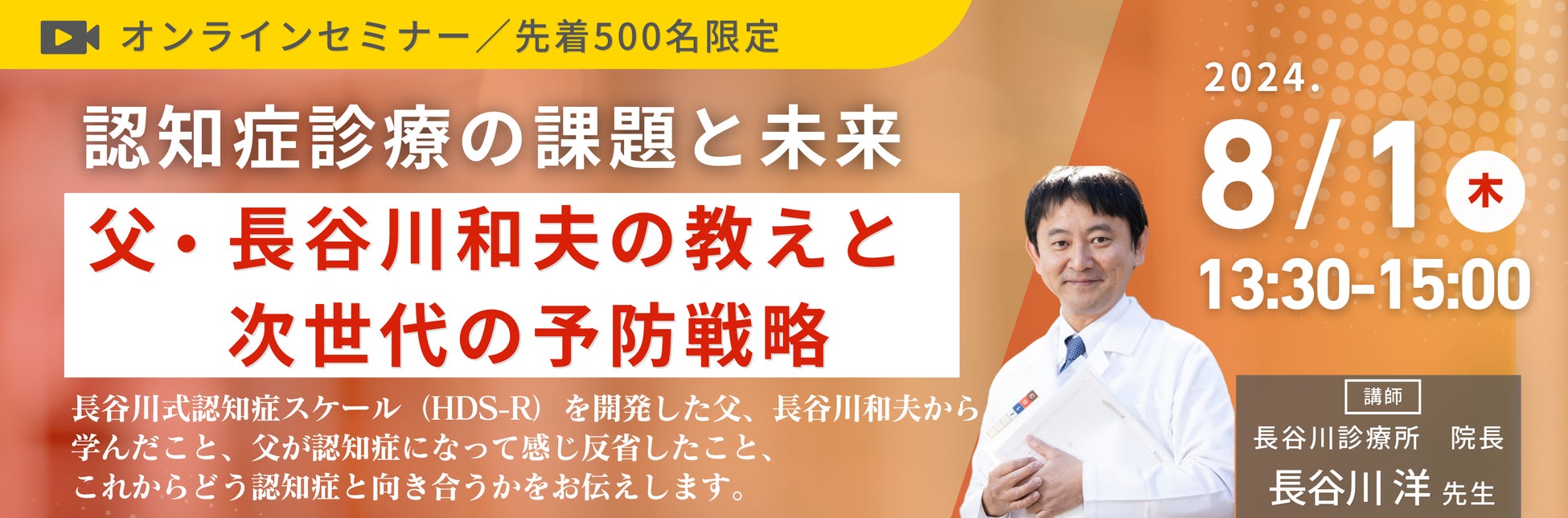 セミナーでは、認知症研究の第一人者である長谷川和夫先生のご長男で、ご自身も精神科医として活躍される長谷川洋先生よりご講演いただきます。『認知症診療の課題と未来:父・長谷川和夫の教えと次世代の予防戦略』と題し、貴重なお話をいただける機会となりますので、是非奮ってご参加ください。
