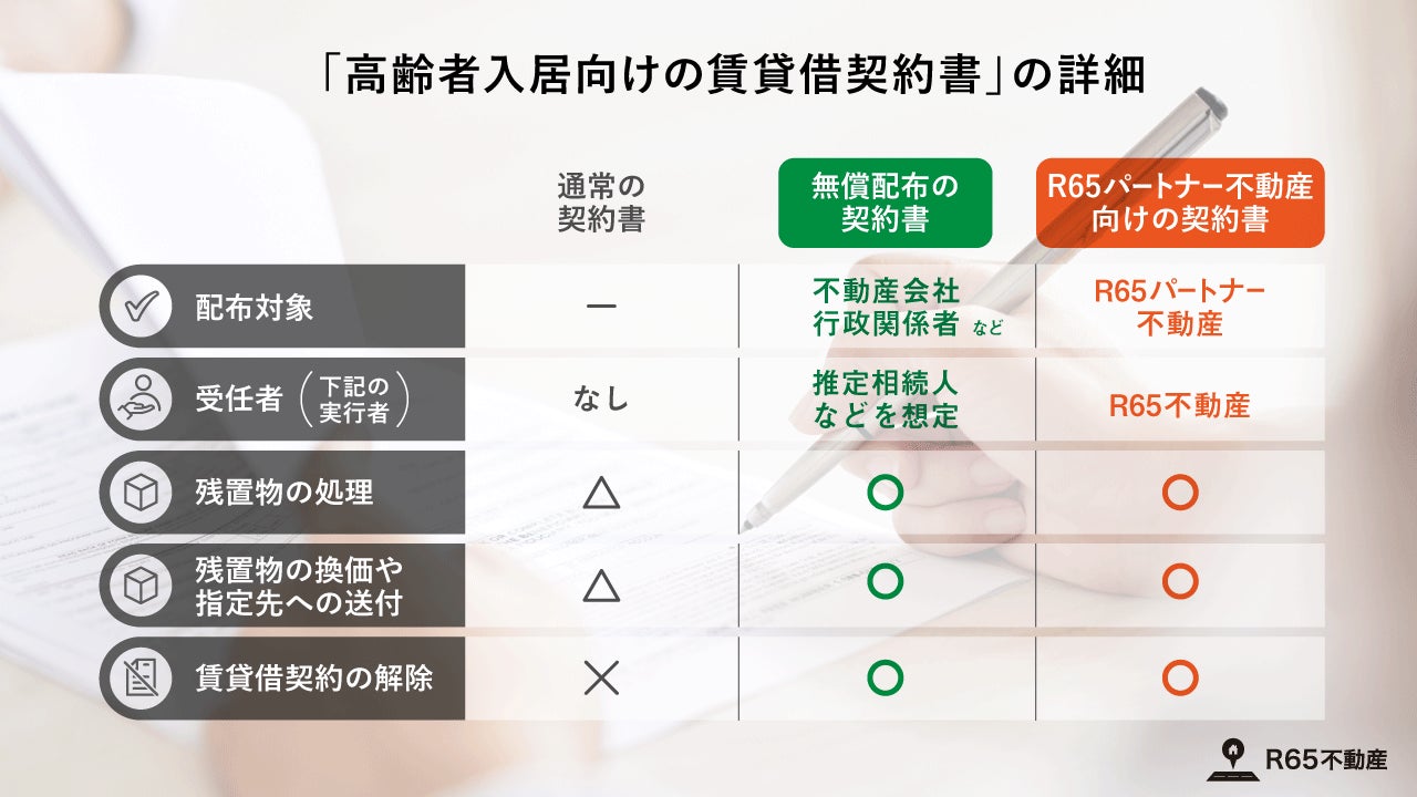 これまでR65不動産では、賃借人の死後に「残置物の処理」や「残置物の換価や指定先への送付」、「賃貸借契約の解除」ができる「高齢者入居向けの賃貸借契約書」の雛形を無償配布するなどの活動を実施してきました。