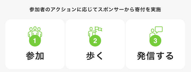 無料で参加できるPEACE WALKではチャリティウォークへの参加数や歩数に応じてスポンサーからマッチング寄付が行われることで、難民支援団体へ寄付を届けます。
