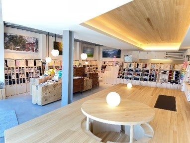 山忠本社向かいの自社靴下工場に併設するファクトリーショップ。「ケアソク」をはじめ、足の健康を考えた機能性ソックスを販売。