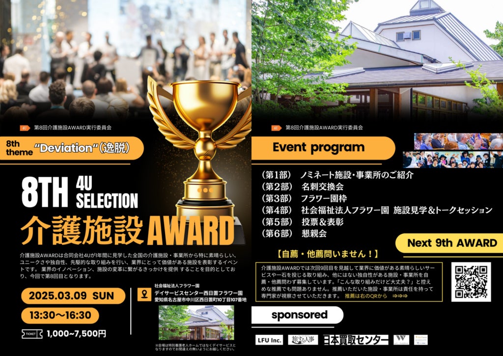 「イノベーション。誰かのために社会を面白くする!」をミッションに全国の介護高齢者施設の見学や施設運営サポートなど行う合同会社4U≪フォーユー≫(兵庫県西宮市、代表:蛯沢渉)は全国1000施設以上から業界に価値のある施設を表彰する 第8回【4U SELECTION】介護施設AWARDが2025年3月9日(日)に開催されます!