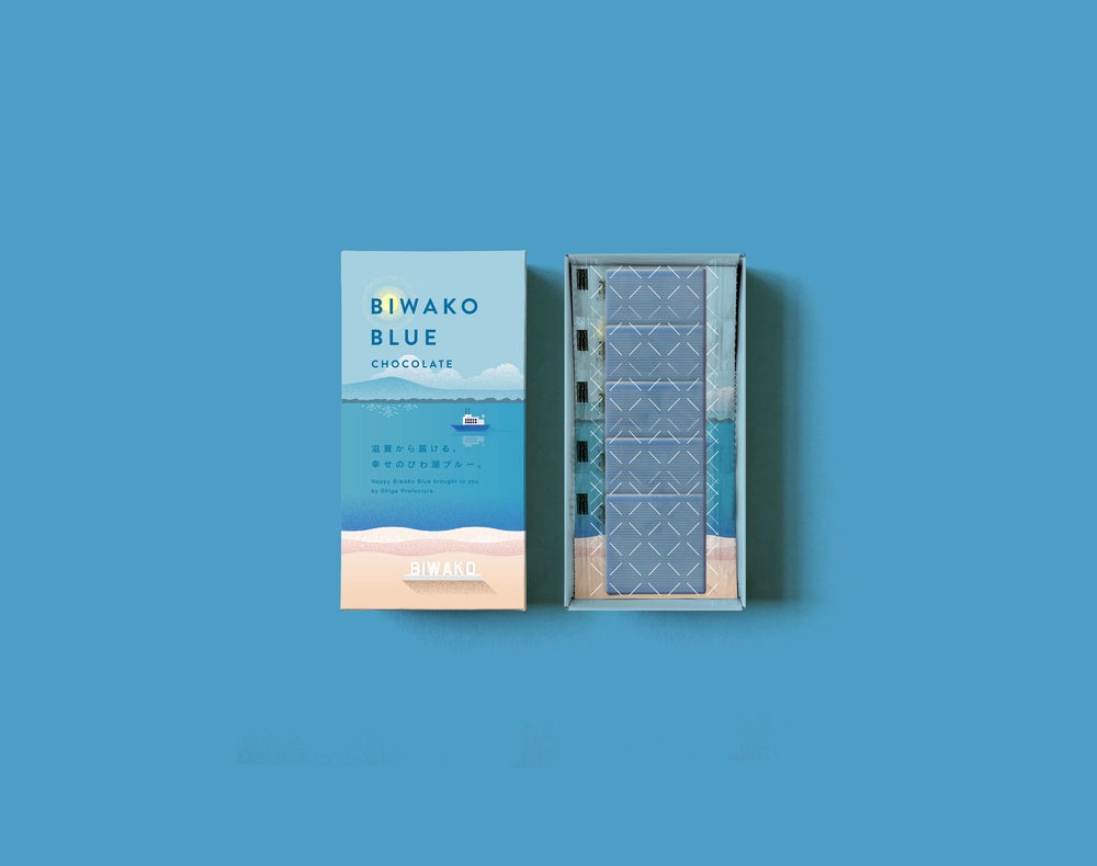 滋賀県のシンボル“びわ湖”をモチーフにした青いショコラ。